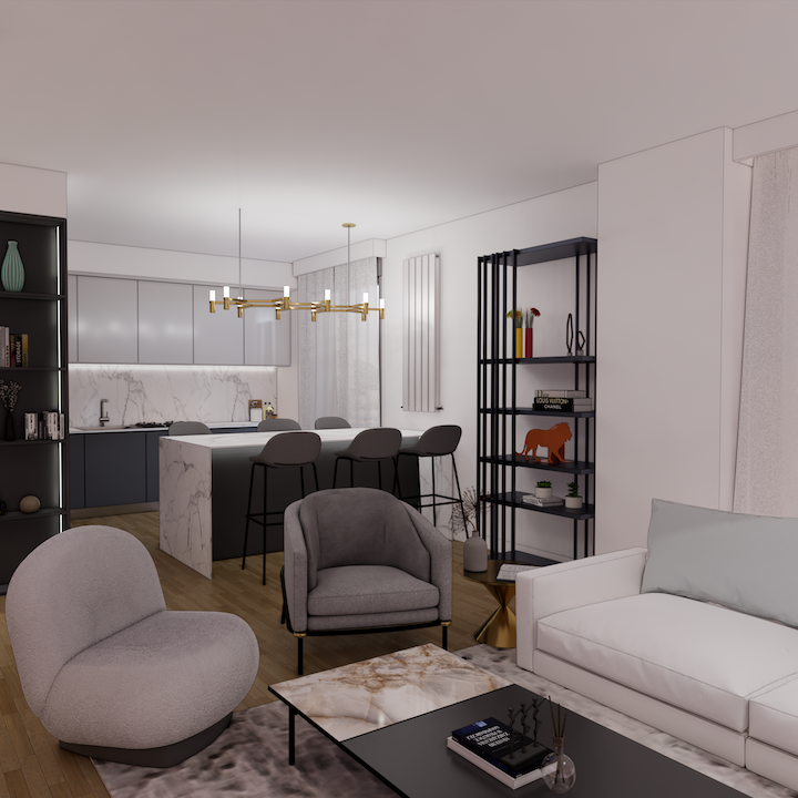 Un open space su misura con cucina a isola, materiali raffinati e arredi su disegno. Soggiorno integrato, camera sartoriale e bagno benessere con vasca freestanding. Comfort, eleganza e funzionalità.