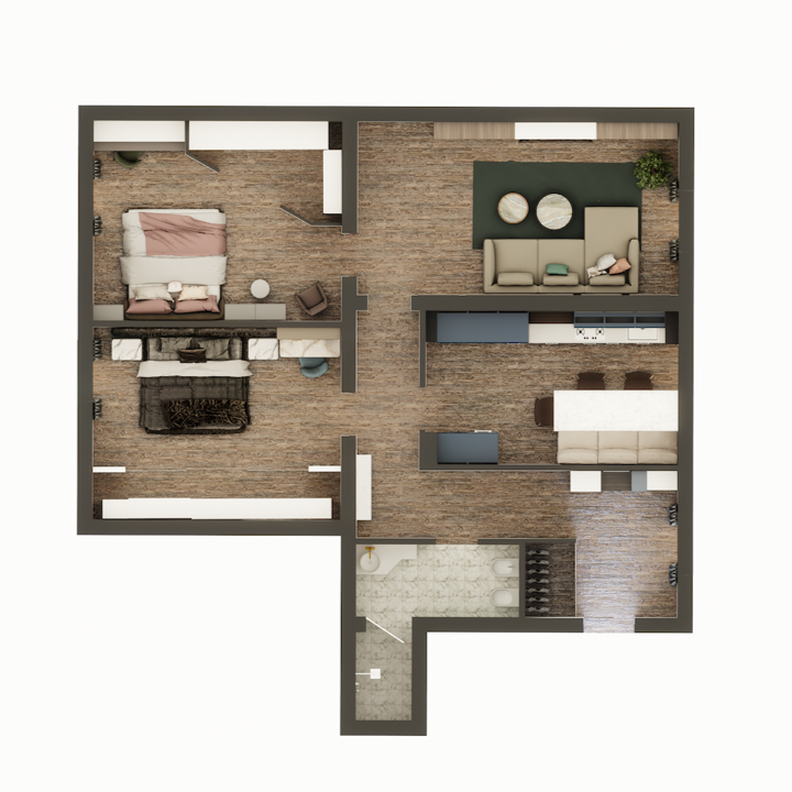 In questo intervento residenziale ci siamo occupati dell’intero processo: dalla progettazione alla ristrutturazione, fino alla definizione dell’interior design. L’obiettivo, condiviso con i committenti, era ripensare integralmente l’appartamento, riorganizzando gli spazi per migliorarne la funzionalità e il comfort abitativo. Siamo partiti dallo studio della planimetria esistente, intervenendo sulla distribuzione interna: le due camere matrimoniali sono state ridimensionate per garantire una gestione più equilibrata degli spazi, mentre la zona giorno è stata riprogettata per ampliare la cucina e rendere più fluido il movimento all’interno dell’ambiente. Anche il bagno è stato completamente rinnovato: la nuova disposizione ha consentito l’inserimento di una doccia di ampie dimensioni, ottimizzando ogni centimetro disponibile. Dopo la fase di ristrutturazione, l’interior designer ha definito l’identità estetica dell’appartamento scegliendo arredi contemporanei e materiali pregiati, pratici da mantenere — in linea con le esigenze della committenza. Il budget complessivo ha incluso tutte le opere: interventi tecnici e murari, illuminazione, serramenti, finiture a parete e pavimento, oltre agli arredi della zona bagno e ai complementi della zona notte.